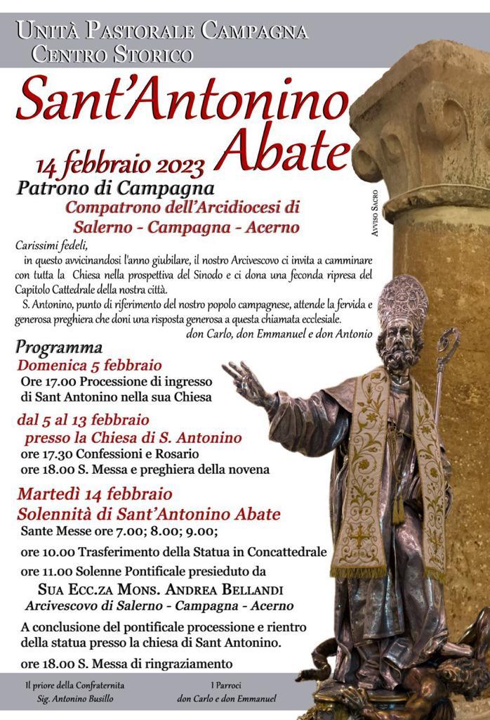 Martedì 14 febbraio ricorre la solennità di sant’Antonino, patrono di Campagna e dell’Arcidiocesi. Alle ore 10.30 S.E. Mons. Andrea Bellandi immetterà nel possesso canonico i nuovi canonici del Capitolo della Concattedrale di Campagna: Spingi mons. Salvatore, Zarra Don Giuseppe, Magna don Carlo, Guerriglia don Giuseppe, Adesso don Angelo Maria. Seguirà alle ore 11.00 la celebrazione eucaristica presieduta dal nostro Arcivescovo.