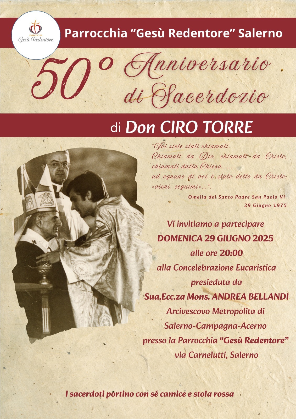 Domenica 29 giugno, alle ore 20.00, presso la parrocchia Gesù Redentore si terrà una Solenne Celebrazione Eucaristica presieduta da Sua Ecc.za Mons. Andrea Bellandi, in occasione del 50° Anniversario di Sacerdozio di don Ciro Torre.