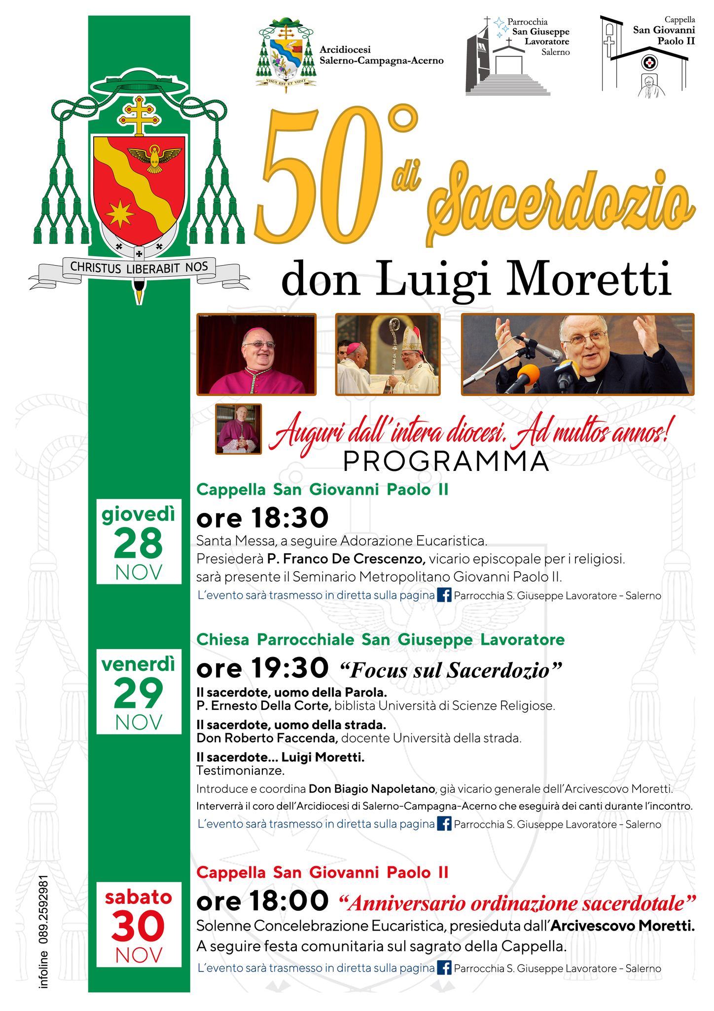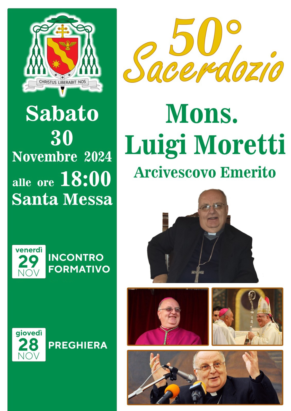 Sabato 30 novembre, alle ore 18.00, presso la parrocchia San Giuseppe Lavoratore si terrà una solenne celebrazione eucaristica per festeggiare il 50° anniversario di sacerdozio di Monsignor Luigi Moretti, Arcivescovo Emerito. La Santa Messa sarà un momento di ringraziamento e di gioia, dove la comunità potrà riunirsi per celebrare il prezioso servizio pastorale di Mons. Moretti nel corso di questi cinquant’anni.