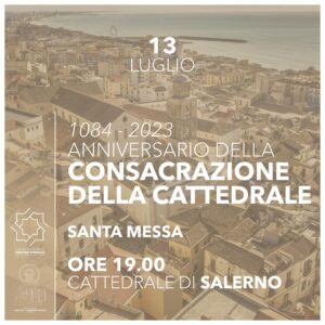 Giovedì 13 luglio alle ore 19.00 presso la Cattedrale, sarà celebrata la Santa Messa in occasione del 939° anniversario della Consacrazione del principale luogo di culto della città di Salerno, fondato sulle reliquie dell’Apostolo Matteo, avvenuta il 13 luglio del 1084 ad opera di Papa Gregorio VII in esilio nella nostra città.