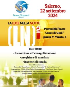 Domenica 22 settembre presso la parrocchia del Sacro Cuore di Gesù, in piazza V. Veneto, Salerno – dalle ore 20.00 alle 23.00, ci sarà l’appuntamento con “La Luce nella Notte”, evento di Evangelizzazione di strada e “Abbracci Gratis” animato dal gruppo del Cenacolo di Nuovi Orizzonti Salerno, (associazione di volontariato internazionale nata nel ’93 da un’ispirazione spirituale di Chiara Amirante).