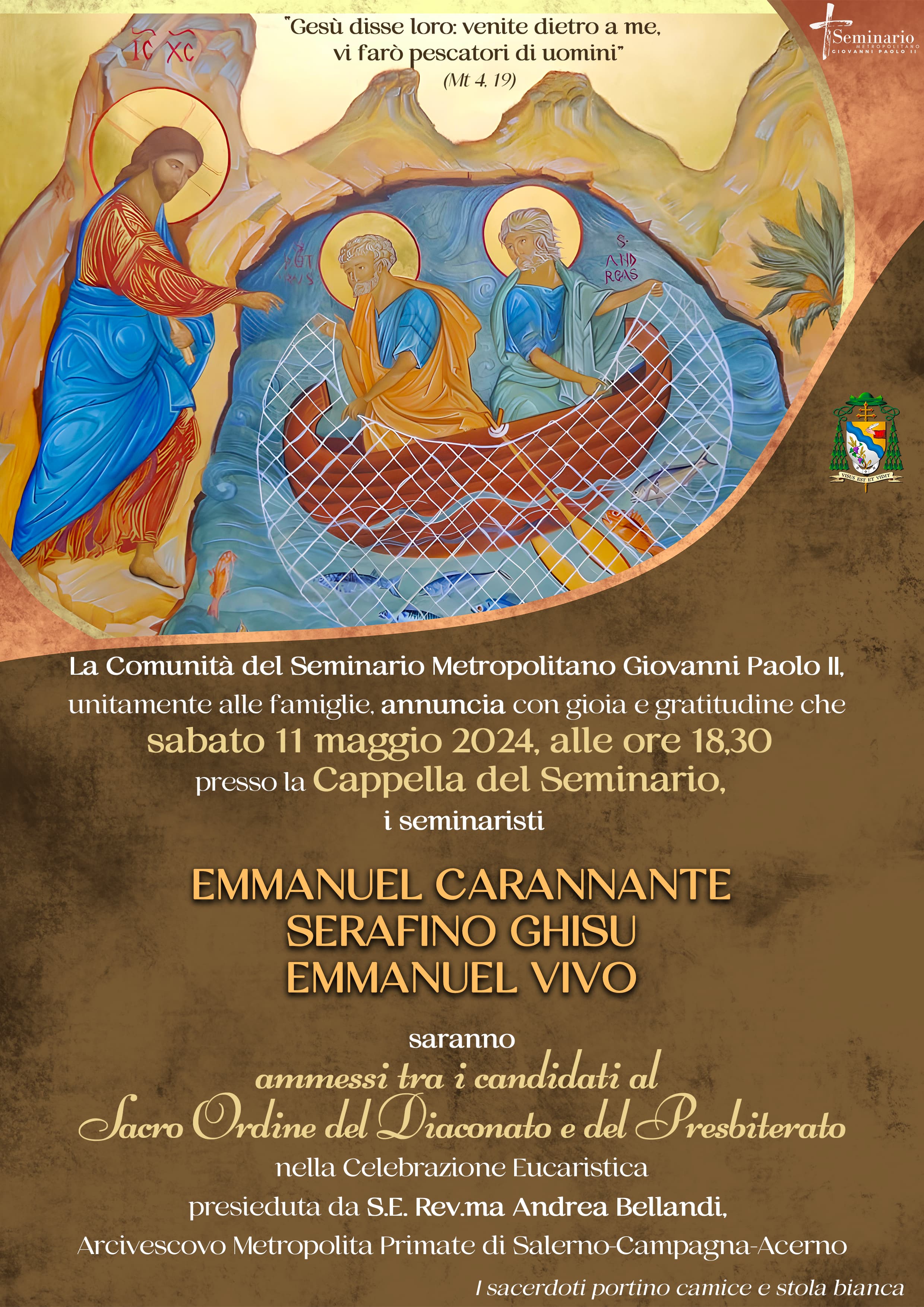 Sabato 11 maggio alle ore 18.30 presso la cappella del Seminario i seminaristi Emmanuel Carannante, Serafino Ghisu e Emmanuel Vivo saranno ammessi al Sacro Ordine del Diaconato e Presbiterato nella Celebrazione Eucaristica presieduta da S.E. Mons. Andrea Bellandi.