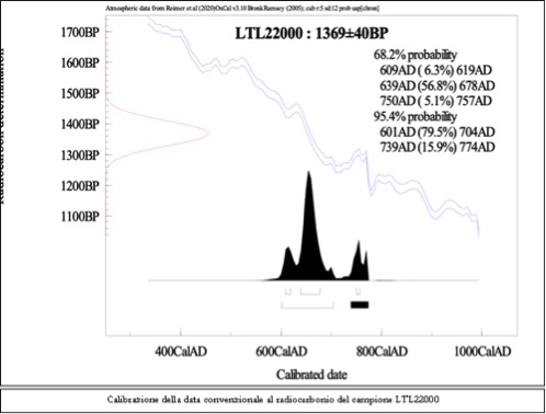 La datazione al radiocarbonio per i campioni è stata quindi calibrata in età di calendario utilizzando il software OxCal Ver. 3.10 basato sui dati atmosferici INTCAL20».