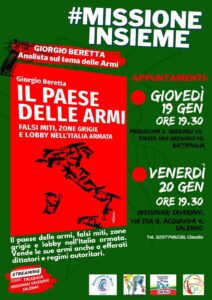 Venerdì 20 gennaio, alle re 19.30 presso i Missionari Saveriani in via Fra G. Acquaviva, 4 a Salerno si tiene un incontro in streaming con Giorgio Beretta, analista dell’osservatorio OPAL e Rete Disarmo....