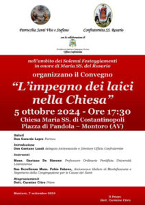 Sabato 5 ottobre alle ore 17.30, presso la chiesa Maria Ss. di Costantinopoli, in piazza di Pandola di Montoro si terrà il convegno dal titolo “L’impegno dei laici nella Chiesa” nell’ambito dei solenni festeggiamenti in onore di Maria SS. del Rosario. Organizzato dalla parrocchia Santi Vito e Stefano e dalla confraternita ...