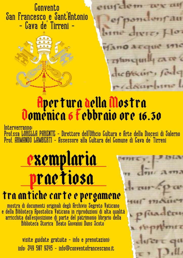 Presso il convento San Francesco e Sant’Antonio di Cava de’ Tirreni, domenica 6 febbraio alle 16.30 si aprirà la mostra “Exemplaria praetiosa”, un’esposizione di antichi e importanti documenti della storia della Chiesa appartenenti all’Archivio Segreto Vaticano e alla Biblioteca Apostolica ...