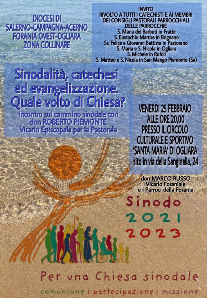 Venerdì 25 febbraio alle ore 20.00, presso il Circolo Culturale e Sportivo “Santa Maria” di Ogliara si tiene un incontro sul Cammino Sinodale tenuto da don Roberto Piemonte, Vicario Episcopale per la Pastorale.