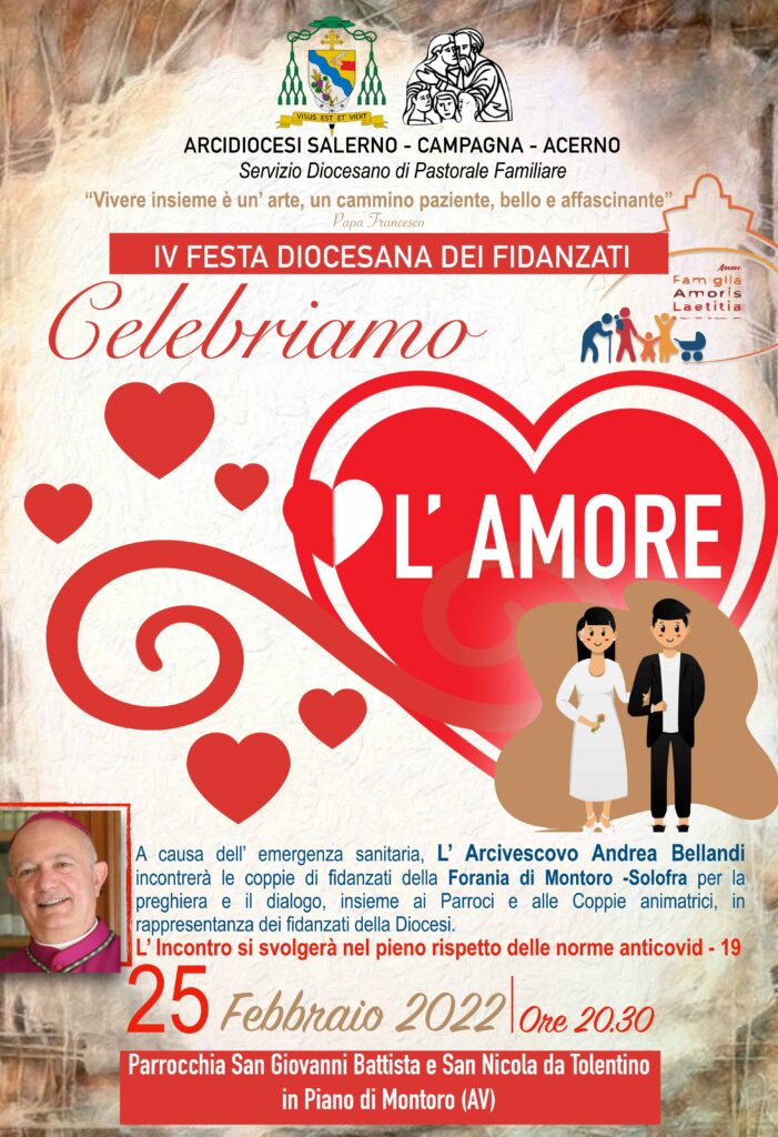 Venerdì 25 febbraio alle ore 20.30, presso la Parrocchia San Giovanni Battista e San Nicola da Tolentino in Piano di Montoro, alla presenza del nostro Arcivescovo Andrea si terrà un incontro con alcune coppie di fidanzati delle parrocchie della Forania ...