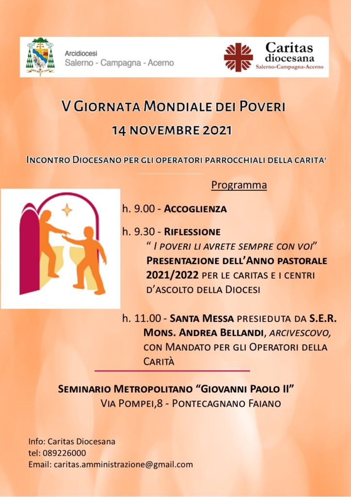Domenica 14 novembre alle ore 9.00 presso il Seminario Metropolitano Giovanni Paolo II di Pontecagnano Faiano, la Caritas Diocesana, in occasione della V Giornata Mondiale dei Poveri, invita i parroci e tutti gli operatori della carità a partecipare ad un ...