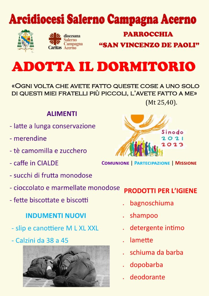C.S. Riapre il dormitorio maschile “Gesù Misericordioso”, e c’è l’iniziativa “adotta il dormitorio” La Caritas di Salerno Campagna Acerno comunica che a partire da lunedì 25 ottobre 2021 riapre le porte il dormitorio “Gesù Misericordioso” in Largo Barbuti nel Centro ...