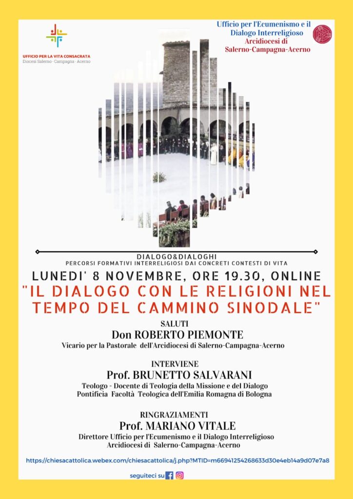 Lunedì 8 novembre, ore 19.30, sulla piattaforma Cisco Webex, l’Ufficio ecumenismo e dialogo interreligioso e l’Ufficio per la Vita Consacrata propongono un incontro dal titolo “Dialogo&Dialoghi – Percorsi formativi interreligiosi dai concreti contesti di vita”. Intervengono Don Roberto Piemonte, Vicario ...
