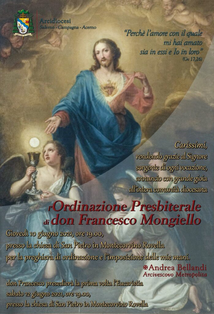 Giovedì 10 giugno, alle ore 19.00, presso la chiesa di San Pietro in Montecorvino Rovella per l’imposizione delle mani e la preghiera di S.E. Mons. Andrea Bellandi viene ordinato presbitero il diacono don Francesco Mongiello.