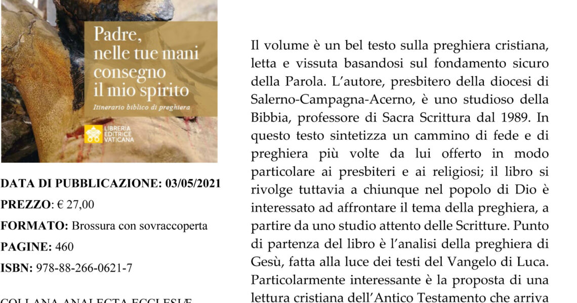 Don Ernesto Della Corte, presbitero dell’Arcidiocesi di Salerno-Campagna-Acerno, studioso della Bibbia, professore di Sacra Scrittura dal 1989 ha pubblicato un itinerario biblico di preghiera dal titolo “Padre, nelle tue consegno il mio spirito” un volume sulla preghiera cristiana, letta e vissuta basandosi sul fondamento ...
