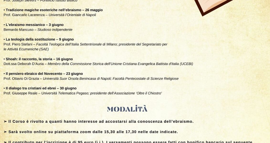 L’Ufficio per l’Ecumenismo e il Dialogo Interreligioso propone il Corso online di introduzione all’ebraismo organizzato dalla Facoltà pentecostale di Scienze Religiose di Bellizzi che si tiene dal 28 aprile al 30 giugno. Il corso offre un primo inquadramento storico-linguistico dell’ebraico classico, la ...