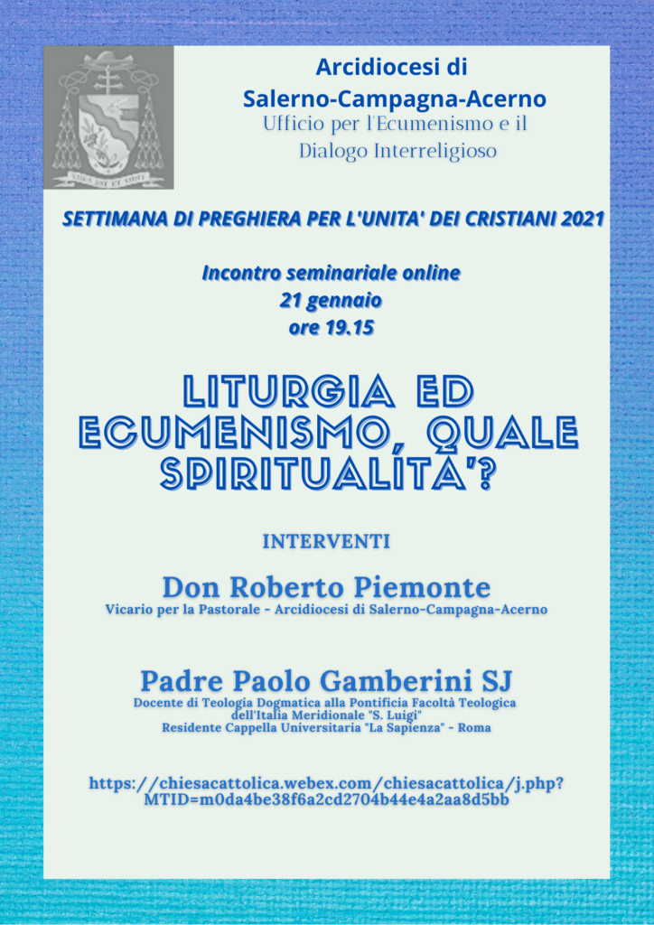 In occasione della Settimana di preghiera per l’Unità dei Cristiani l’Ufficio per l’Ecumanismo e Dialogo Interreligioso, invita i sacerdoti diocesani a partecipare al seminario sull’ecumenismo che si tiene giovedì 21 gennaio alle ore 19.15