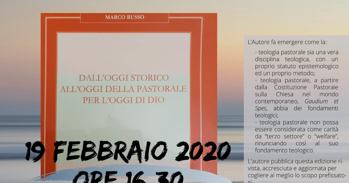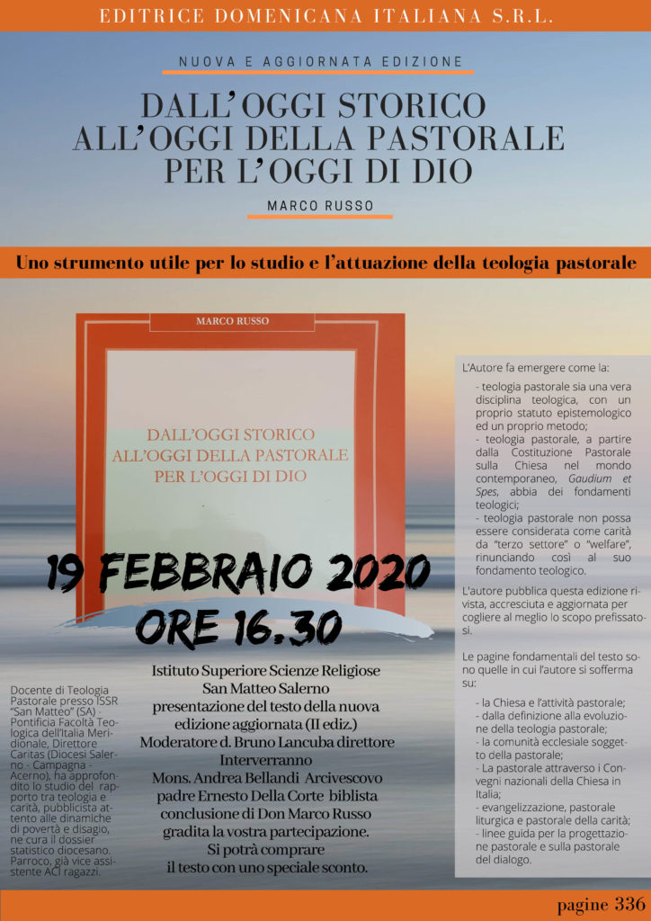 Presentazione del libro di don Marco Russo “Dall’oggi storico, all’oggi della pastorale, per l’oggi di Dio” Si presenterà mercoledì 19 febbraio alle ore 16.30, presso la sede dell’Istituto Superiore di Scienze Religiose di Salerno, in via Bastioni, la nuova edizione ...