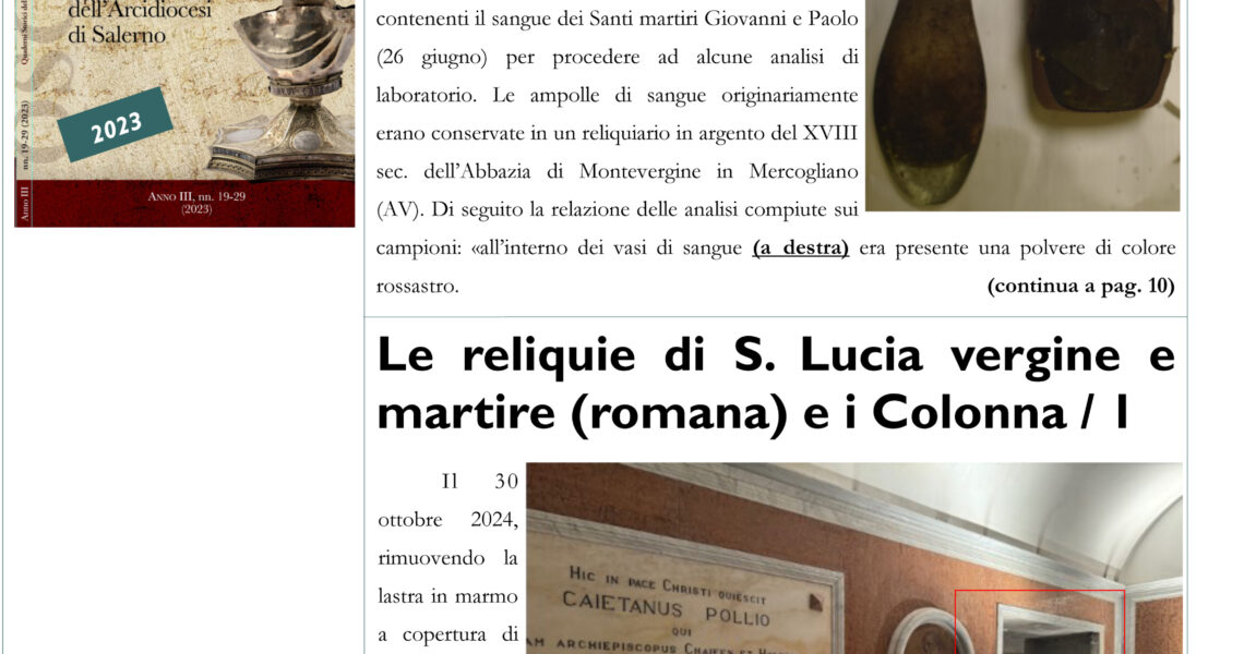Nell’edizione QSCRAS numero 5 del mese di maggio, in apertura, troviamo due approfondimenti: il primo è uno studio sulle analisi condotte su due ampolle vitree contenenti il sangue di San Massimo, vescovo di Nola custodite nell’Abbazia di Montevergine in Mercogliano ...