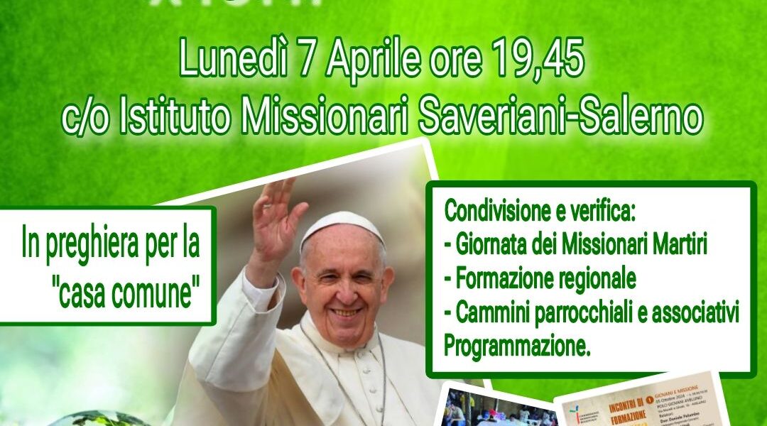 Lunedì 7 aprile alle ore 19.45 presso l’Istituto Missionari Saveriani a Salerno si terrà l’incontro di Preghiera e Formazione Missionaria. Questo appuntamento, organizzato dal Centro Missionario, è aperto a tutti e sarà un momento di condivisione e verifica su temi ...