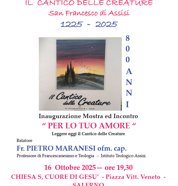 Mercoledì 16 ottobre, alle ore 19.30, presso la Chiesa del Sacro Cuore di Gesù in Piazza Vittorio Veneto a Salerno, in occasione degli 800 anni del Cantico delle Creature di San Francesco d’Assisi (1225–2025), il Centro Interculturale e Ricerca “TAU” ...