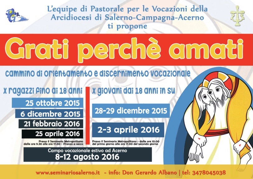 L'equipe di Pastorale per le Vocazioni ha organizzato un cammino di orientamento e discernimento vocazionale per ragazzi e per giovani, "Grati perchè amati", che si terrà presso il Seminario Metropolitano Giovanni Paolo II in Pontecagnano Faiano (Sa)