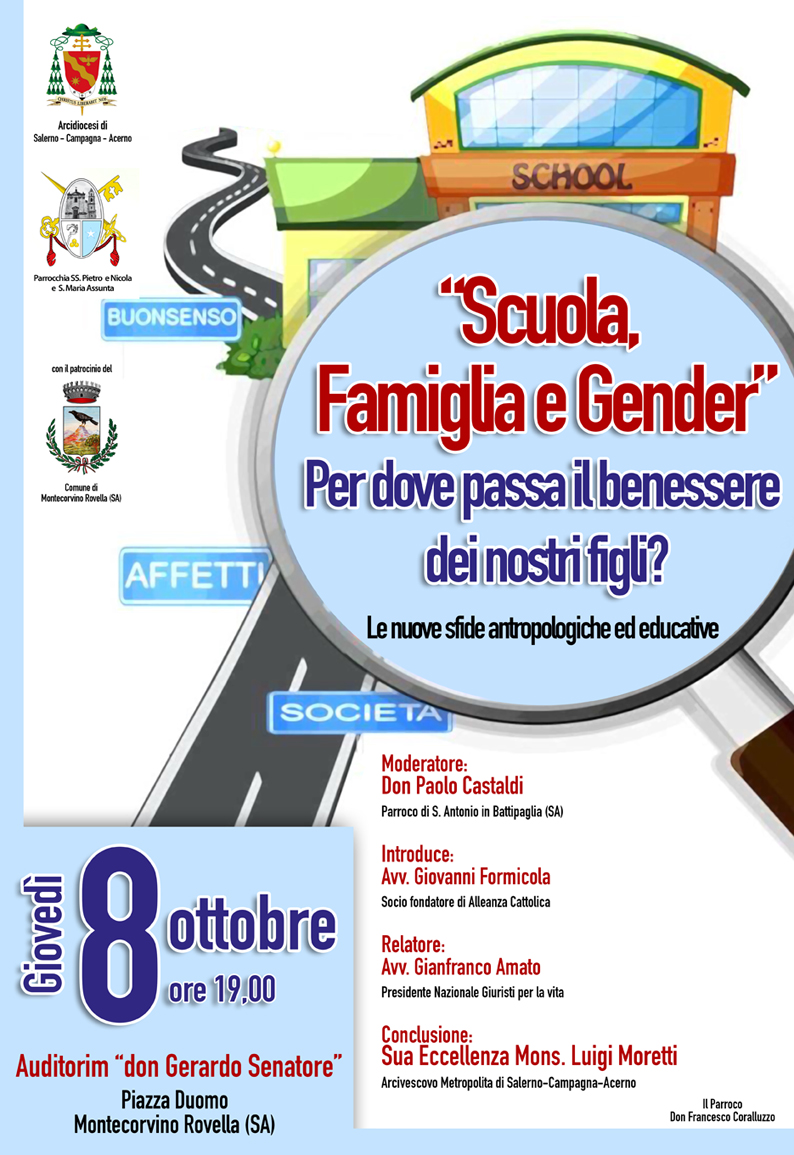 “Scuola, famiglia e gender ” è l’argomento di formazione per l’incontro di giovedì 8 Ottobre 2015, alle ore 19.00, presso Auditorium “don Gerardo Senatore”, a Montecorvino Rovella. Giovanni Formicola socio fondatore di Alleanza Cattolica e Gianfranco Amato, presidente giuristi per la vita, saranno ...