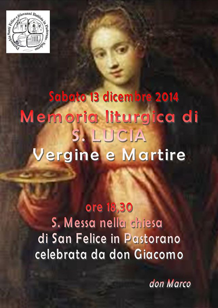 Sabato 13 dicembre ore 18.30 S. Messa nella chiesa di san Felice in Pastorano in memoria di S. Lucia