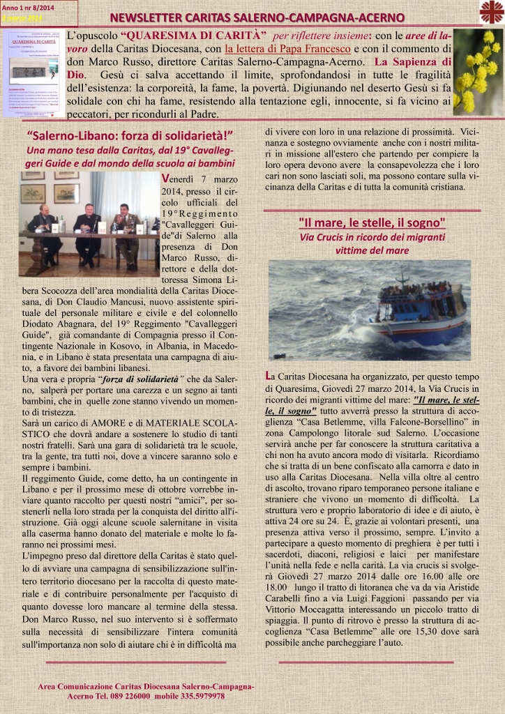 “Salerno-Libano: forza di solidarietà!” Una mano tesa dalla Caritas, dal 19° Cavalleggeri Guide e dal mondo della scuola ai bambini libanesi Allegati: NEWS LETTER 8.pdf