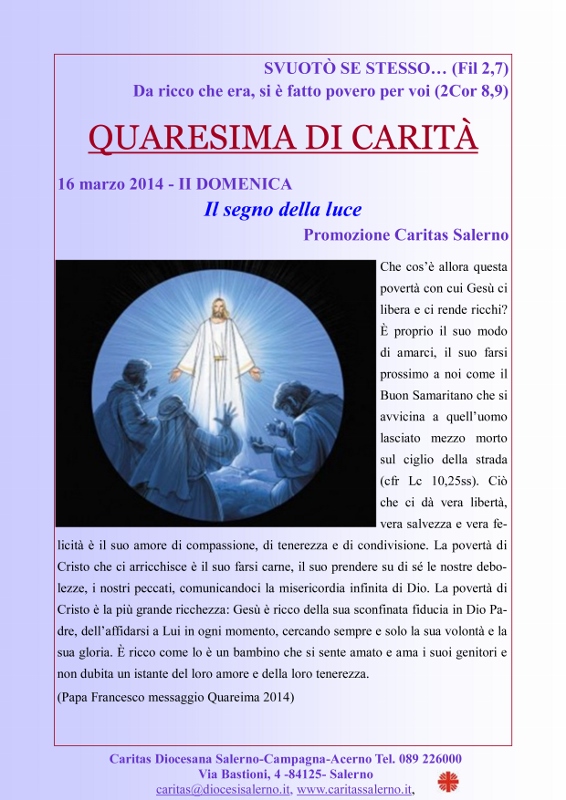 Quante volte risuona alle nostre orecchie la parola povero, ma soprattutto con ancora più forza che Egli si è svuotato per rendersi uguale a me. Allegati: quaresima di carità 2014 prima domenica.pdf