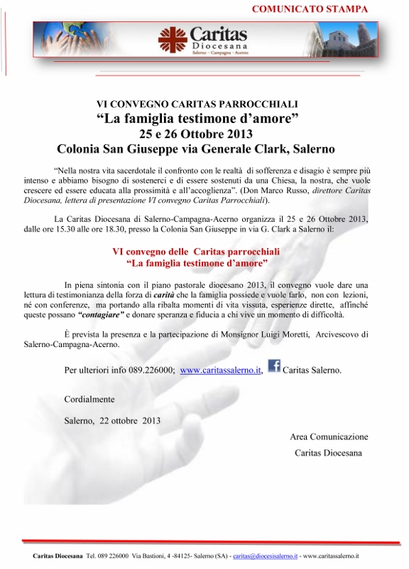 Conferenza Stampa dell’Arcivescovo di Salerno-Campagna-Acerno monsignor Luigi Moretti per presentare il documento “Evangelizzare la pietà popolare” Norme per le feste religiose e processioni Sabato 9 novembre 2013 ore 11.00 Palazzo Arcivescovile Via Roberto il Guiscardo, 2 – Salerno Allegati: Decreto ...