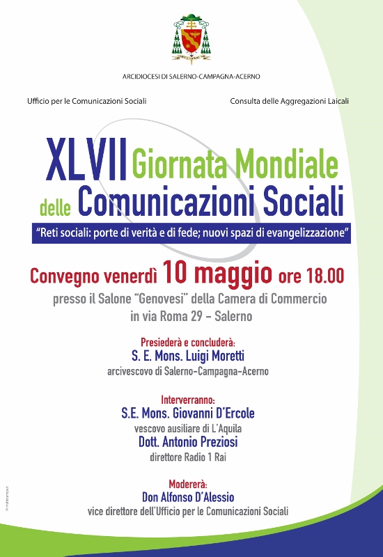 Convegno XLVII Giornata Mondiale delle Comunicazioni Sociali venerdì 10 maggio 2013 alle ore 18.00 salone Antonio Genovesi Camera di Commercio – via Roma (Salerno) interverranno S.E. Mons. Giovanni D’Ercole, vescovo ausiliare di L’Aquila Dott. Antonio Preziosi, direttore Radio 1 Rai ...