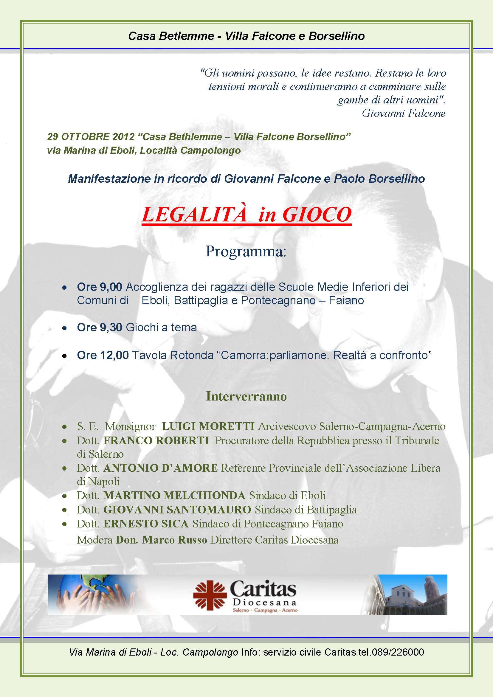 Lunedì 29 ottobre ore 12.00 S.E. Monsignor Luigi Moretti partecipa alla tavola rotonda in ricordo di Giovanni Falcone e Paolo Borsellino: “CAMORRA: PARLIAMONE. REALTÀ A CONFRONTO” presso “Casa Bethlemme-Villa Falcone e Borsellino” in via Marina di Eboli loc. Campolongo