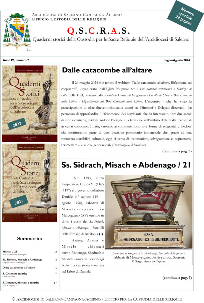 L’edizione QSCRAS numero 7, luglio e agosto 2024, è un numero doppio composto da venti pagine. La prima pagina apre nella prima parte con un approfondimento che fa riferimento al webinar del 24 maggio 2024 dal titolo “Dalle catacombe all’altare. ...