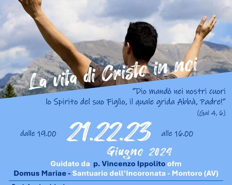 Dal 21 al 23 giugno si terrà un ritiro residenziale per giovani e adulti presso la Domus Mariae del Santuario dell’Incoronata di Montoro (Av) guidato dal p. Vincenzo Ippolito dal titolo “La vita di Cristo in noi”.
