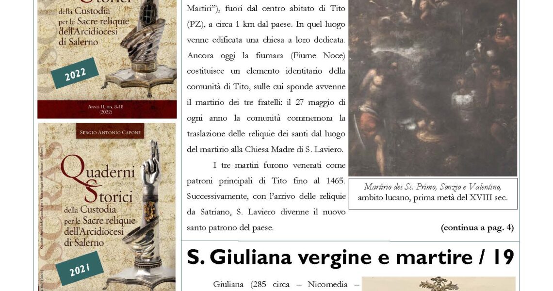 L’edizione QSCRAS numero 5, maggio 2024, è un numero speciale composto da venti pagine. Le prime pagine sono dedicate a S. Giuliana vergine e martire e la rubrica “Beati e Santi: nuove acquisizioni” tratta di S. Romaniana, Ss. Cresci e ...