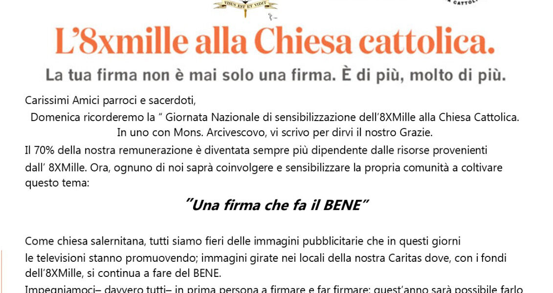 Inizia domenica 5 maggio, in tutte le parrocchie della nostra Arcidiocesi, la campagna di promozione a sostegno della firma 8xmille per la Chiesa Cattolica. Il 70% della remunerazione dei sacerdoti è diventata sempre più dipendente da questa risorsa. Il Servizio diocesano ...