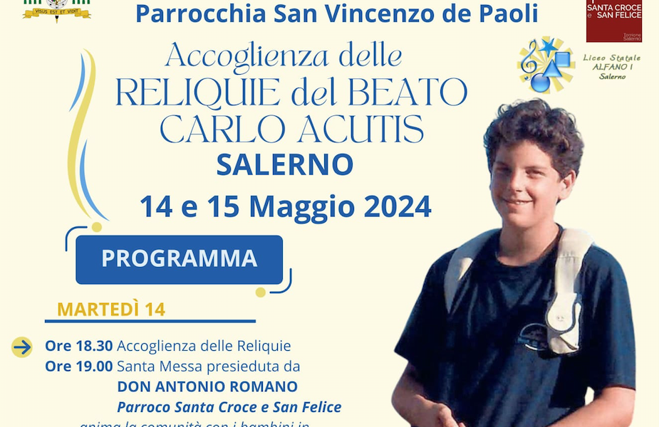 Il 14 e il 15 maggio la parrocchia San Vincenzo de Paoli di Salerno accoglie le Reliquie del Beato Carlo Acutis, ragazzo dei giorni nostri che in un breve tratto della sua vita è diventato testimone di Dio per i ...