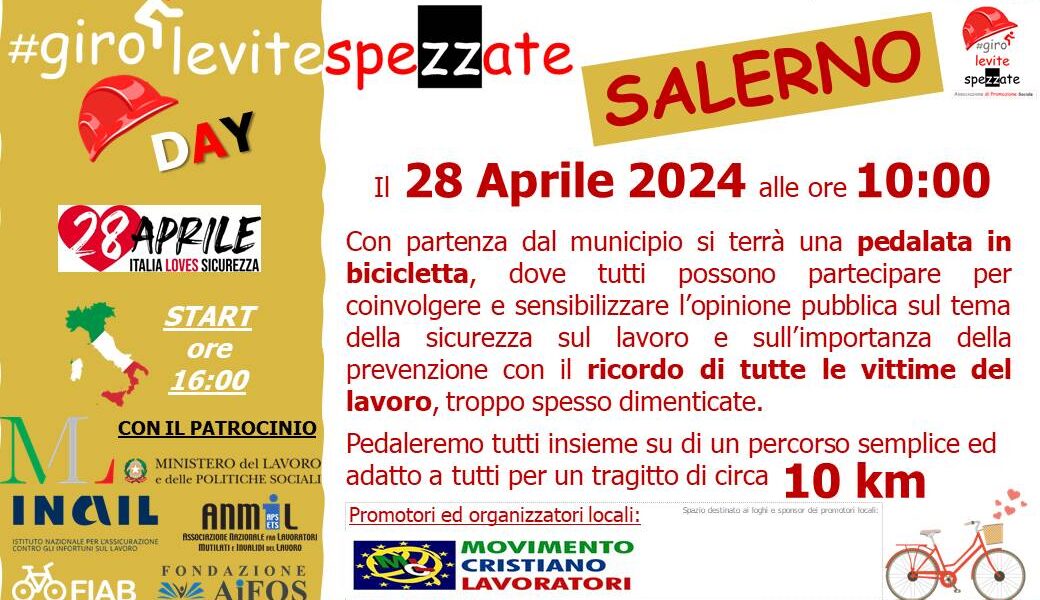 Domenica 28 aprile alle ore 10.00, dal Municipio di Salerno, partirà la pedalata per coinvolgere e sensibilizzare l’opinione pubblica sul tema della sicurezza sul lavoro. Un’iniziativa nazionale che coinvolge enti, istituzioni e associazioni, promossa dall’associazione “Giro le vite spezzate” in ...