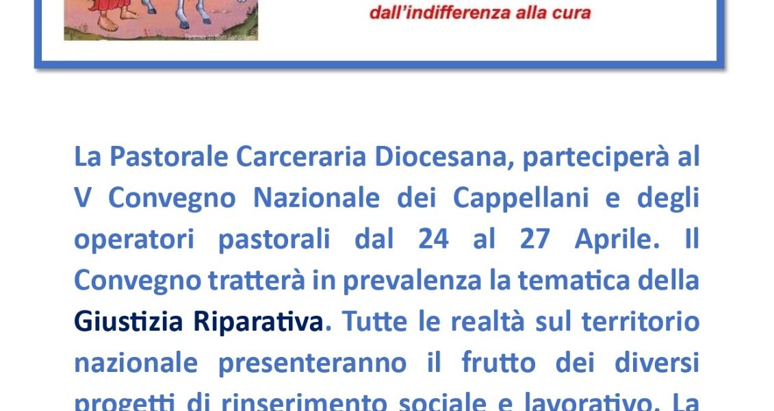 Dal 24 al 27 aprile ad Assisi si terrà il V Convegno Nazionale dei cappellani e degli operatori della Pastorale Penitenziaria. Il convegno tratterà in prevalenza la tematica della Giustizia Riparativa. Tutte le realtà sul territorio nazionale presenteranno il frutto ...