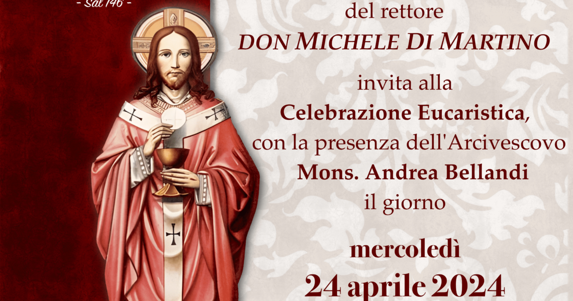 Mercoledì 24 aprile alle ore 18.30 presso la Cappella Maggiore del Seminario Metropolitano si terrà la Celebrazione Eucaristica con la presenza di S.E. Mons Andrea Bellandi in occasione del 25° anniversario di sacerdozio di don Michele Di Martino.