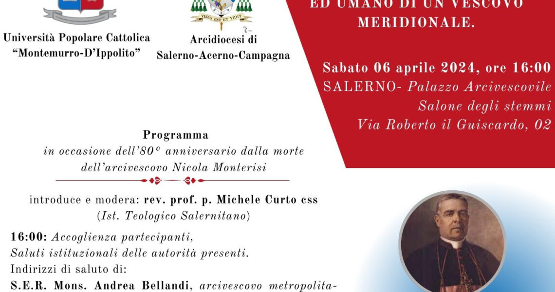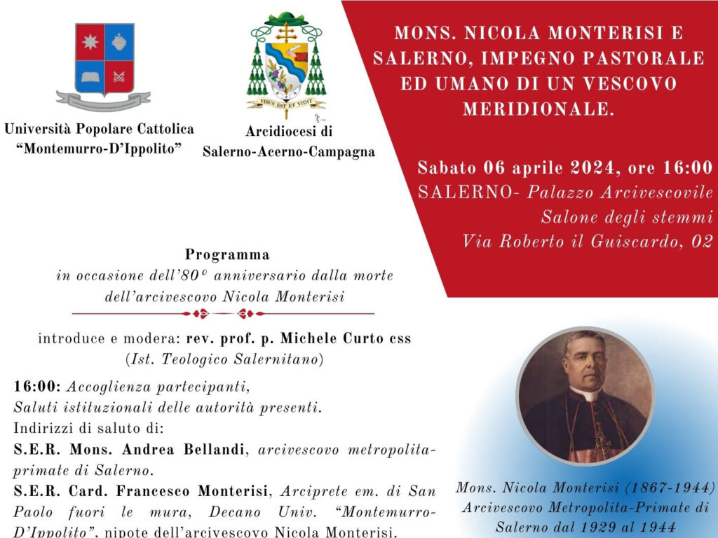 Sabato 6 aprile alle ore 16.00 nel Salone degli Stemmi del Palazzo Arcivescovile in occasione dell’80° anniversario dalla morte dell’arcivescovo Nicola Monterisi si terrà un convegno dal titolo “Mons. Nicola Monterisi e Salerno, impegno pastorale ed umano di un vescovo ...