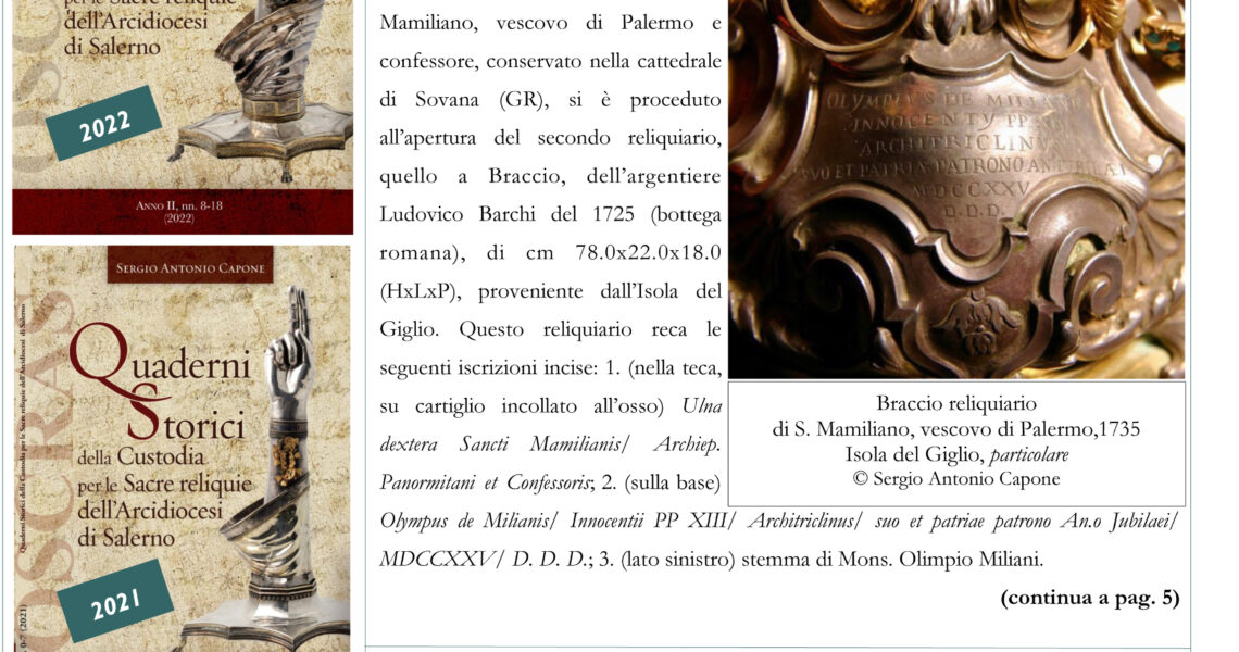 L’edizione QSCRAS numero 3, marzo 2024, apre con la seconda parte della ricognizione canonica di S. Mamiliano vescovo di Palermo e con S. Vittore, vescovo di Capua. Nella rubrica “Beati e Santi” elenca le nuove acquisizioni delle reliquie provenienti dal ...