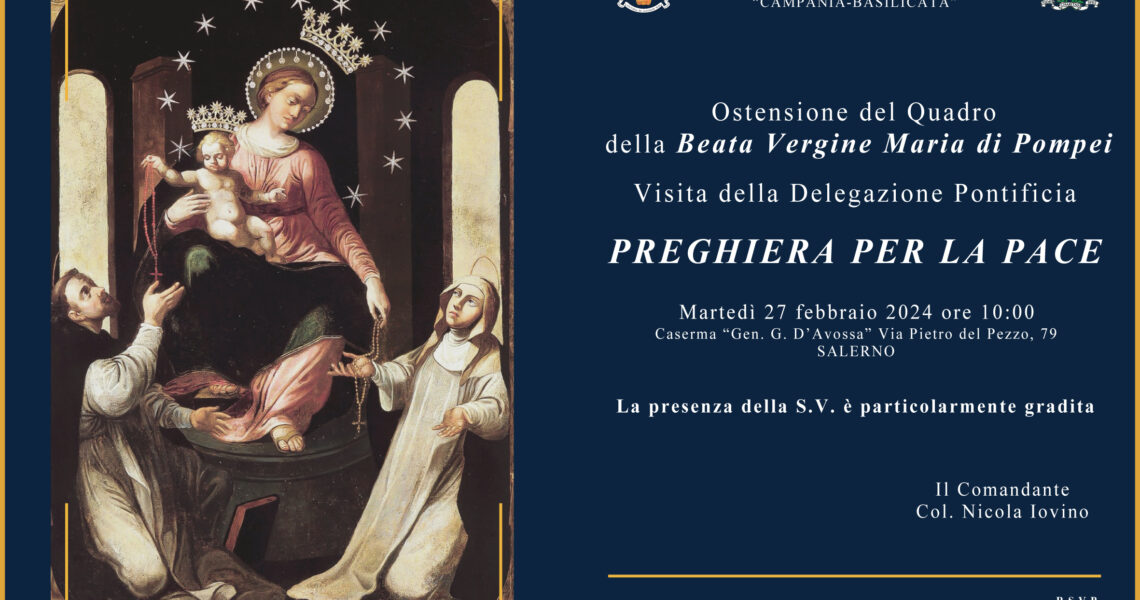 Martedì 27 febbraio alle ore 10.00 presso la caserma “Gen. G. D’Avossa”, in Salerno si terrà l’ostensione del quadro della Beata Vergine Maria di Pompei in occasione della visita della delegazione Pontificia.