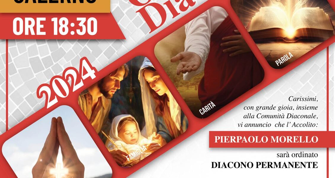 Domenica 7 gennaio alle ore 18.30 nel Duomo di Salerno Pierpaolo Morello sarà ordinato diacono permanente per l’imposizione delle mani e la Preghiera di consacrazione di S.E. Mons. Andrea Bellandi. La liturgia sarà animata dal gruppo del Rinnovamento nello Spirito.