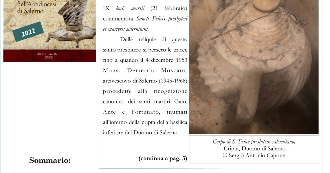 Il numero di novembre 2023 si apre con le reliquie di S. Felice presbiterio e martire salernitano e i santi Pascasio e Marco abati di Montevergine. Nella rubrica “Beati e Santi: nuove acquisizioni” tratta poi delle reliquie dei martiri conservate ...