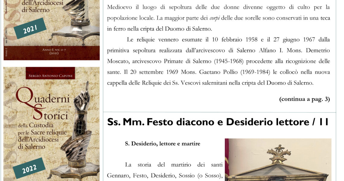 L’edizione QSCRAS numero 9 del mese di ottobre 2023, apre la sua prima pagina con le ricognizioni canoniche delle reliquie delle sorelle di S. Prisco, custodite nella cripta del Duomo di Salerno, e delle reliquie dei Ss. Martiri Festo e ...