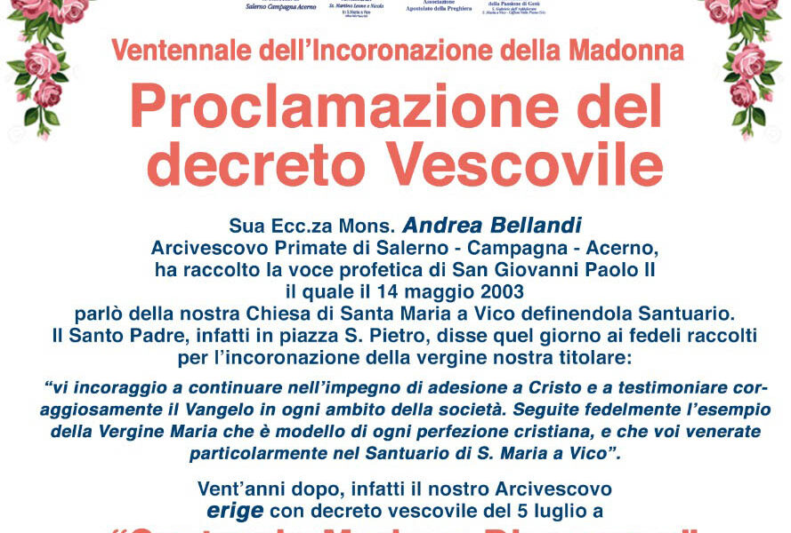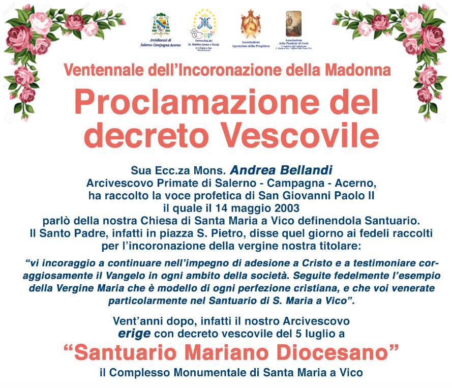 Domenica 23 luglio alle ore 19.30 presso il complesso monumentale di Santa Maria a Vico, in occasione del ventennale dell’Incoronazione della Madonna, si terrà il solenne Pontificale e la proclamazione del decreto vescovile di erezione a Santuario di Santa Maria ...