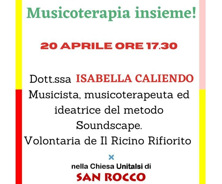 Giovedì 20 aprile alle 17:30 presso la chiesa di San Rocco, in via Mercanti, la dottoressa Isabella Caliendo, musicista e musicoterapeuta, terrà un incontro, dal titolo “Musicoterapia insieme!”, organizzato dall’Unitalsi Salerno in collaborazione con l’associazione Il Ricino Rifiorito Onlus. Per informazioni ...