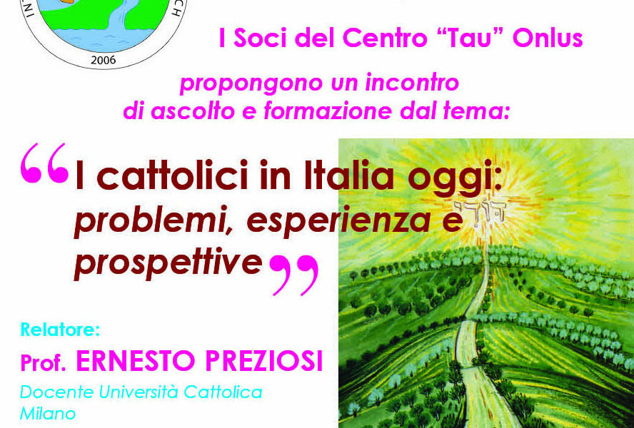 Martedì 25 ottobre alle ore 18.00 presso la Camera di Commercio di Salerno si tiene un incontro dal tema “I cattolici in Italia oggi: problemi, esperienza e prospettive” organizzato dal Centro Interculturale e ricerca “Tau” Onlus, relaziona il prof. Ernesto Preziosi, ...