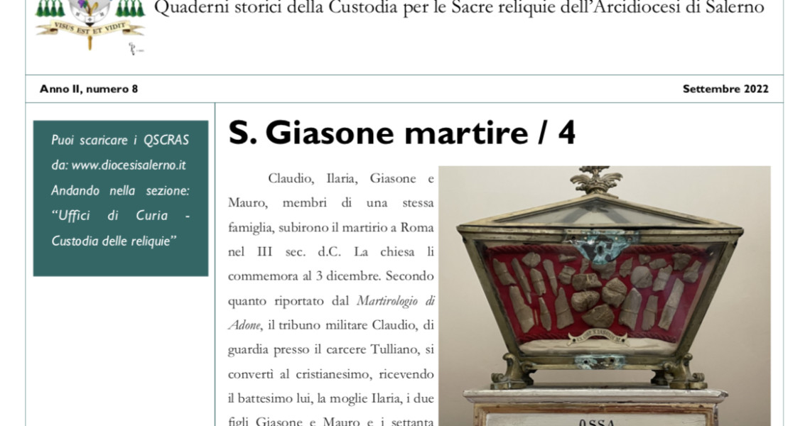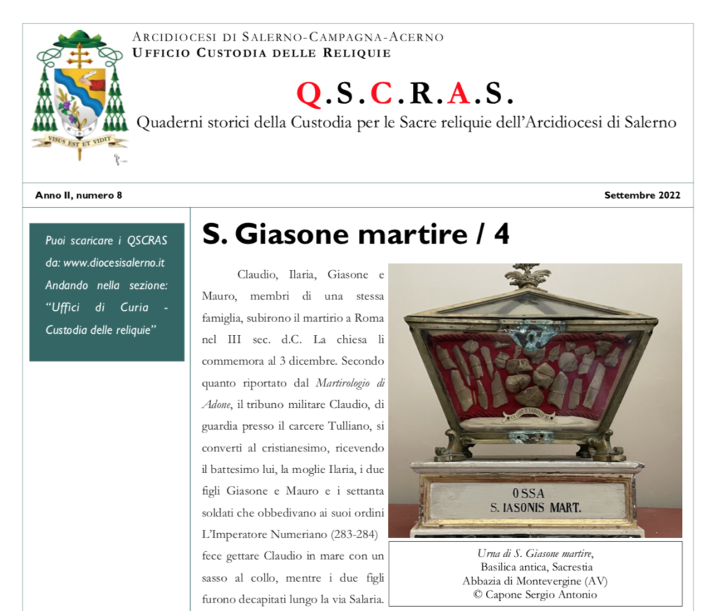 L’edizione QSCRAS numero 8 del mese di settembre 2022, apre la sua prima pagina, per continuare a pagina 4, con le reliquie di San Giasone Martire, custodite presso l’Abbazia di Montevergine (Av), si occupa poi del sangue di S. Pantaleone ...