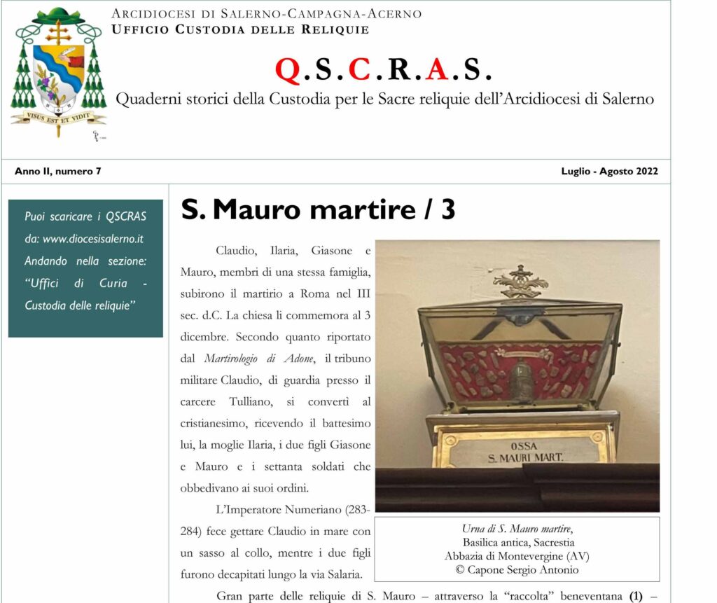 L’edizione QSCRAS numero 7 dei mesi di luglio e agosto 2022, si occupa delle reliquie di San Mauro Martire, di quelle custodite presso l’ex Monastero di Santa Teresa in Solofra, dei reliquiari di Caggiano e, infine, è possibile leggere una ...